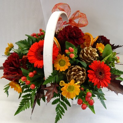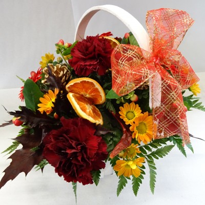 Let our florists create a pretty basket arrangement using seasonal flowers in festive tones. Available in reds and golds or whites and silvers. ( Basket and flowers may vary slightly to picture depending on stock and seasonal availability )